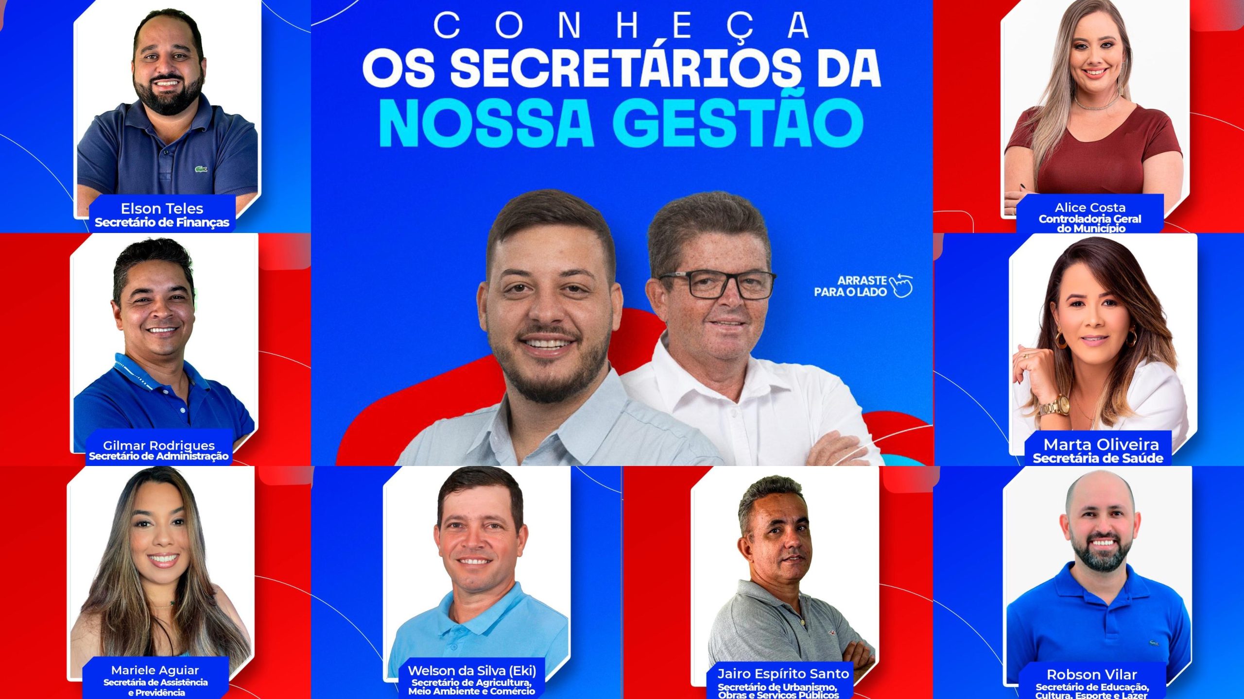 De acordo com o prefeito ocuparão as pastas os seguintes nomes: Elson Teles assumirá a Secretaria de Finanças; Gilmar Rodrigues a Secretaria de Administração; Robson Vilar a Secretaria de Educação, Cultura, Esporte e Lazer; Marta Silva, a Secretaria de Saúde; Welson da Silva (Eki), a da Agricultura, Meio Ambiente e Comércio; Jairo Espírito Santo será o novo secretário de Urbanismo, Obras e Serviços Públicos; Mariele Aguiar assumirá a Assistência Social e Previdência; e Alice Costa será a Controladora Geral do município.